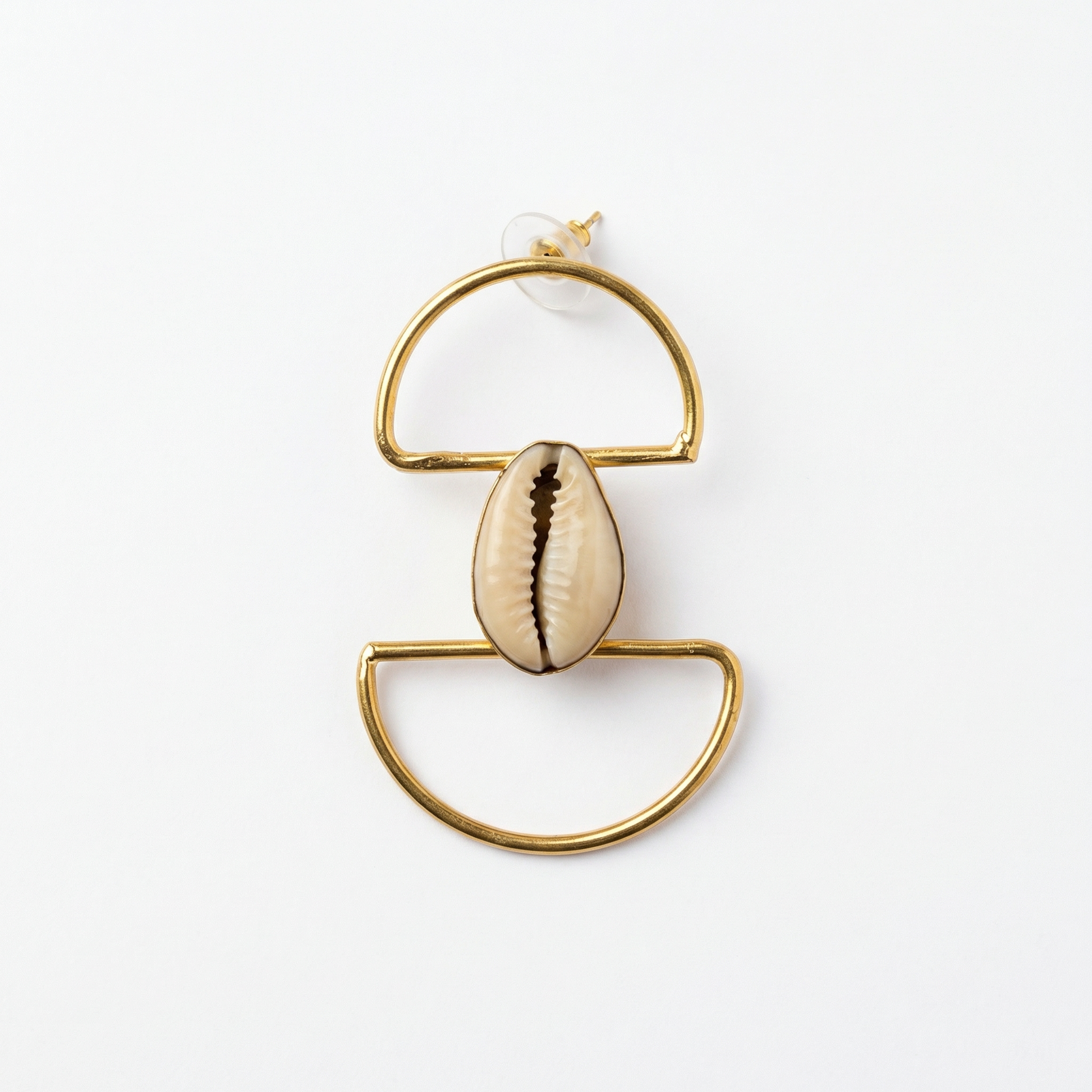 Leur structure en demi-cercles dorés encadre délicatement un cauri naturel, symbole ancestral de féminité, de prospérité et de protection dans les cultures africaines.