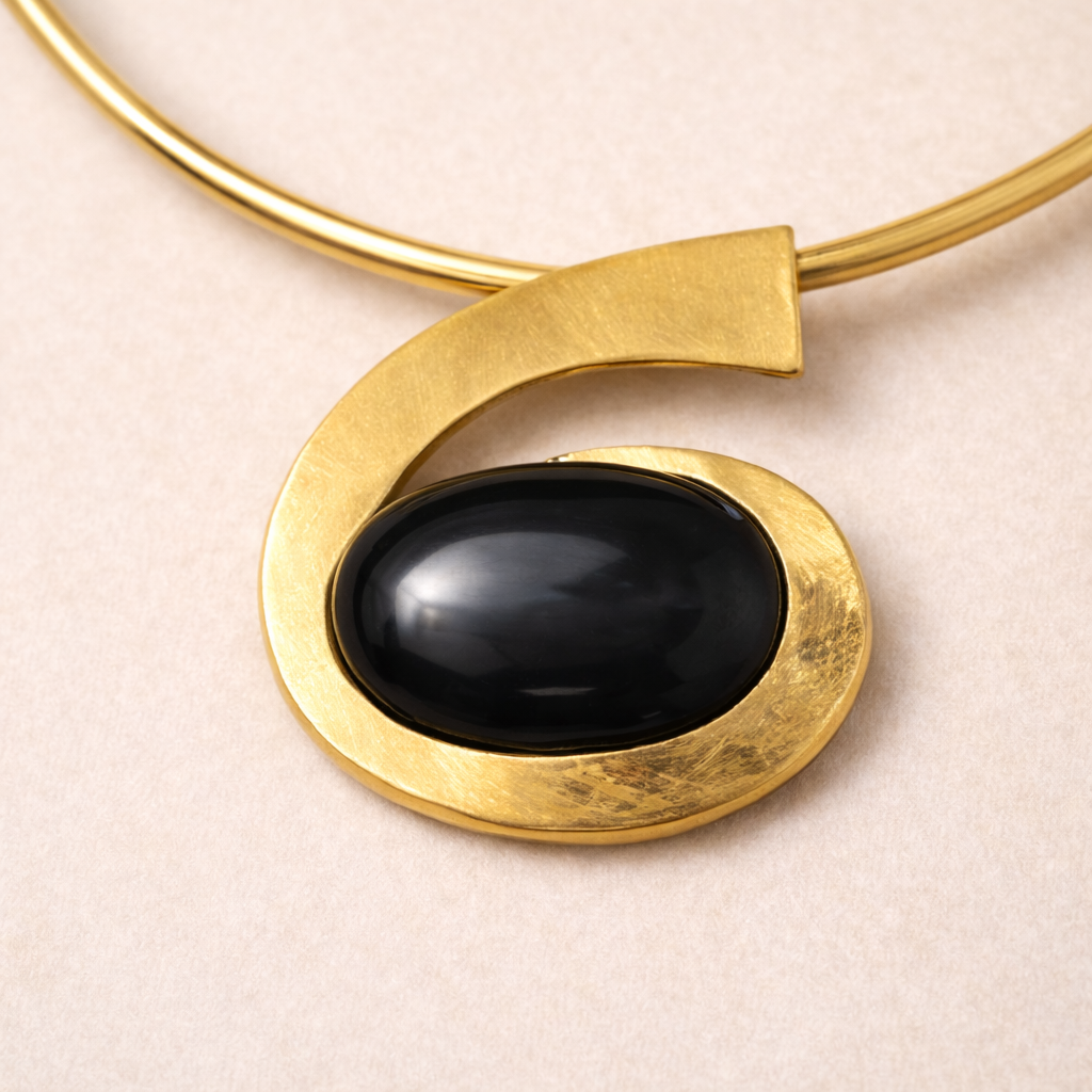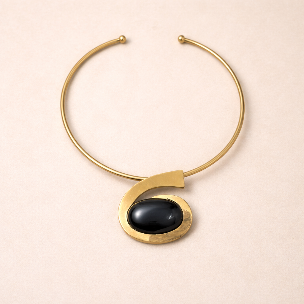Sa structure rigide en métal doré dessine une ligne pure autour du cou, tandis qu’une pierre noire centrale apporte profondeur et mystère. La courbe graphique qui entoure la pierre crée un mouvement fluide, inspiré des formes organiques et du design africain contemporain.